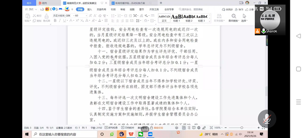 为了让舍长们明确自身职能,邓拓老师专门强调了舍长职务的重要性,并向舍长们下达了宿舍查寝、建立宿舍公约的任务。在会议中,21级全体舍长们意识到新环境下,更要像“螺丝钉”一样坚守岗位,具有高度的责任和担当。线上会议秩序井然,参会人员积极发言。