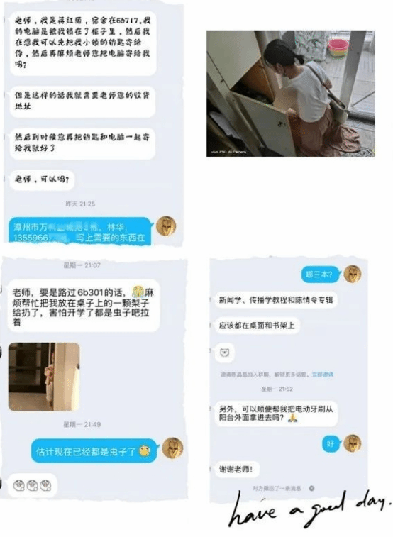 部分学生假期遗漏在校的电脑、书籍、学习资料,以及毕业班学生们的相关材料、毕业档案,毕业设计、研究生复试等必需物品,辅导员们第一时间与学生沟通,获知相关信息后,协助同学们提供材料,办理好每一份寄送物品。甚至还贴心的充当了一回“宿舍管理人员”,清扫落灰的书籍、过期食品,收回阳台上长久飘扬的潮湿衣物,接过同学们每一把信任的书柜钥匙,让尘封已久的专业书籍“物归原主”。学生们的一句句“谢谢”,是对辅导员工作的最大认可。